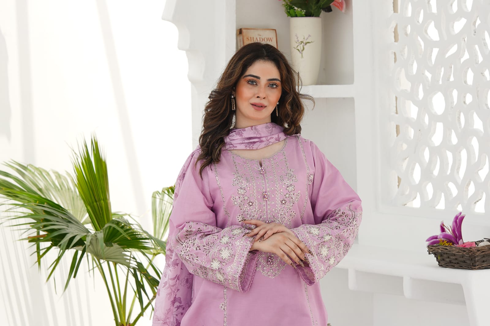 This 3-piece Lawn dress features a long panelled shirt in Lilac color  with heavy embroidery at the neckline, creating an elegant focal point. The intricate spread embroidery at the side panels adds depth and visual interest. The shirt is further adorned with a heavy embroidered border, and the sleeves are embellished with intricate bowing and border details, elevating the look with a refined touch. To add an extra layer of sophistication, all finishes are meticulously done with crochet lace.